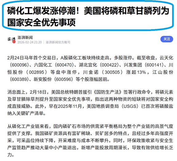 @妙想 #美国将元素磷及草甘膦纳入关键战略物资##稀土小金属走强,战略资源价值重估持续##瑞银大幅上调锂价预测:或迎超级周期##存储巨头:存储芯片涨价潮将贯穿2026年##油运市场火热,VLCC日租金创六年新高#$兴发集团(SH600141)$ $华邦健康(SZ002004)$ $川金诺(SZ300505)$