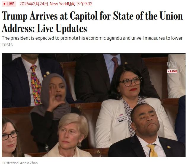 当地时间2月24日,美国总统特朗普在国情咨文演讲现场遭民主党议员喝倒彩。图片来源:《华尔街日报》网站直播截图