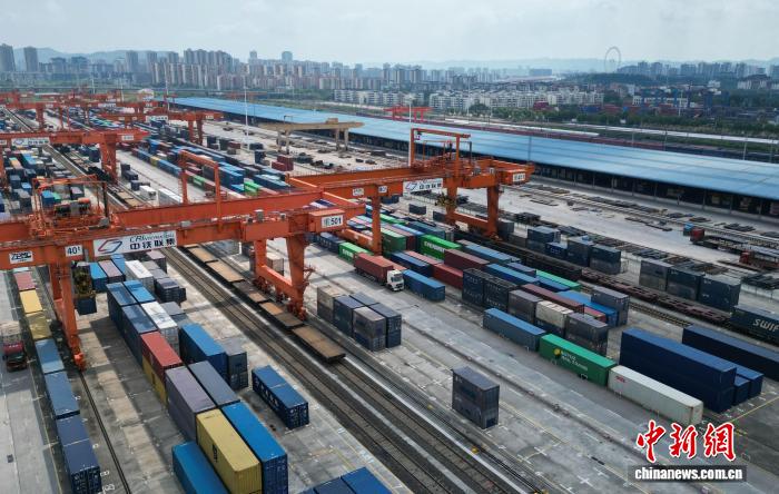 图为航拍重庆团结村铁路集装箱中心站。该站现有4条货物装卸线,中欧班列、西部陆海新通道、渝甬等国际班列均由这里始发。中新网记者周毅摄