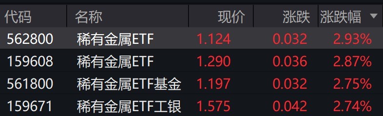 稀有金属概念股走高,北方稀土涨超6%,中国稀土涨超4%,中矿资源涨超3%,华友钴业、盐湖股份涨超2%。