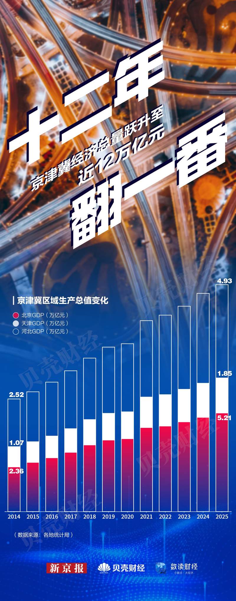 协同发展十二年来,京津冀区域经济规模持续扩大、一体化格局日益深化。三地经济总量从2014年的5.95万亿元上升至2025年的近12万亿元,连续跨越六个万亿元台阶,总量实现翻番。