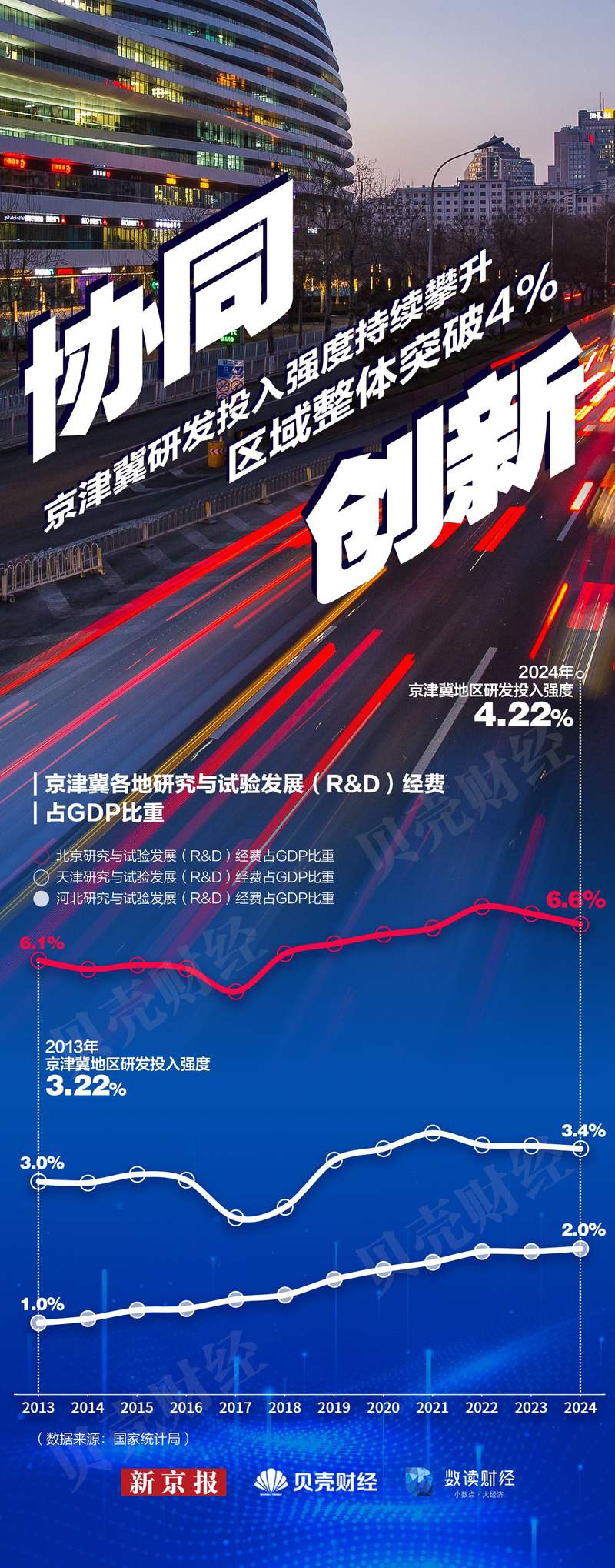 区域协同创新底盘同样明显加厚。北京R&D经费投入占比长期保持6%左右,头雁效应下,天津投入强度从2013年的2.98%稳步抬升到2024年的3.44%,河北从2013年的1.00%提升至2024年的2.04%。
