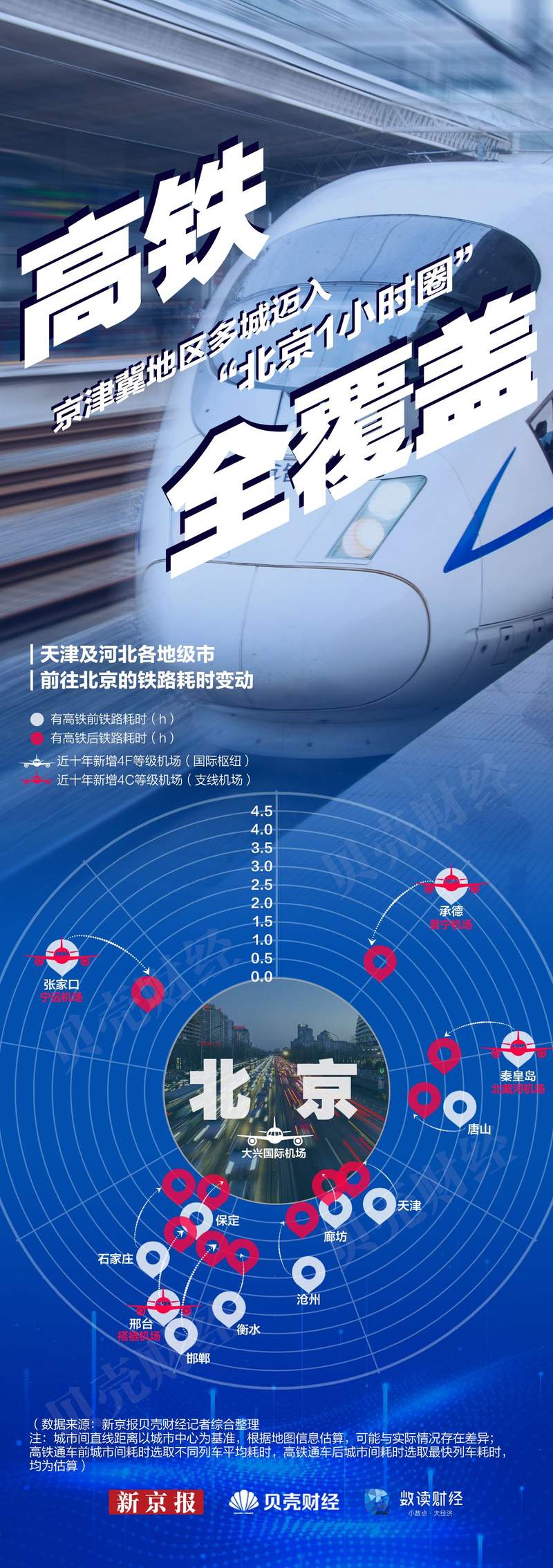 新京报贝壳财经记者梳理看到,北京市到京津冀各地级市的高铁通达时间普遍压缩在2小时以内。以最快车次计算,直线距离最远的邯郸仅需1小时37分;京哈高铁北京至承德段开通后,两地旅行时间由原来近4小时大幅缩短至最快50分钟。
