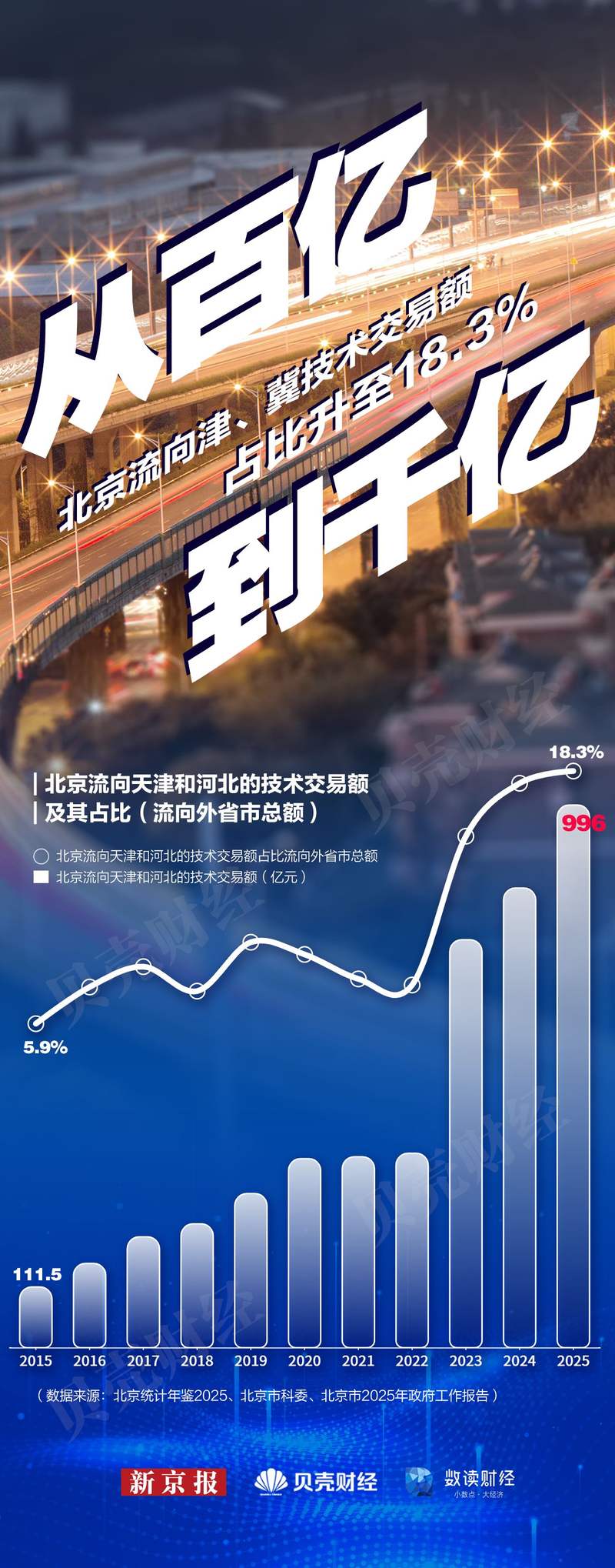 创新要素的跨区域流动,是协同深化的直观体现。数据显示,北京流向天津、河北的技术交易额由2015年的111.5亿元增长至2025年的996亿元,占流向外省市技术交易总额的比重由5.9%提升至18.3%,实现从“百亿级”到“近千亿级”的跃升。