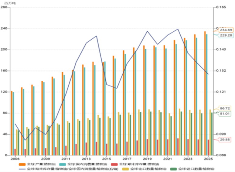 全球植物油供应充足。2025/2026年度全球植物油产量将达到2.32亿吨,略高于消费量,呈现小幅过剩态势。分类别来看,棕榈油供需基本平衡。印尼和马来西亚的产能扩张持续推进,2026年产量有望达到7800万吨;豆油方面,美国、巴西大豆产量创新高,豆油供应保持充足,预计达到6200万吨;菜油方面,加拿大、欧盟菜籽油产量稳定增长,全球供应将超过3100万吨。