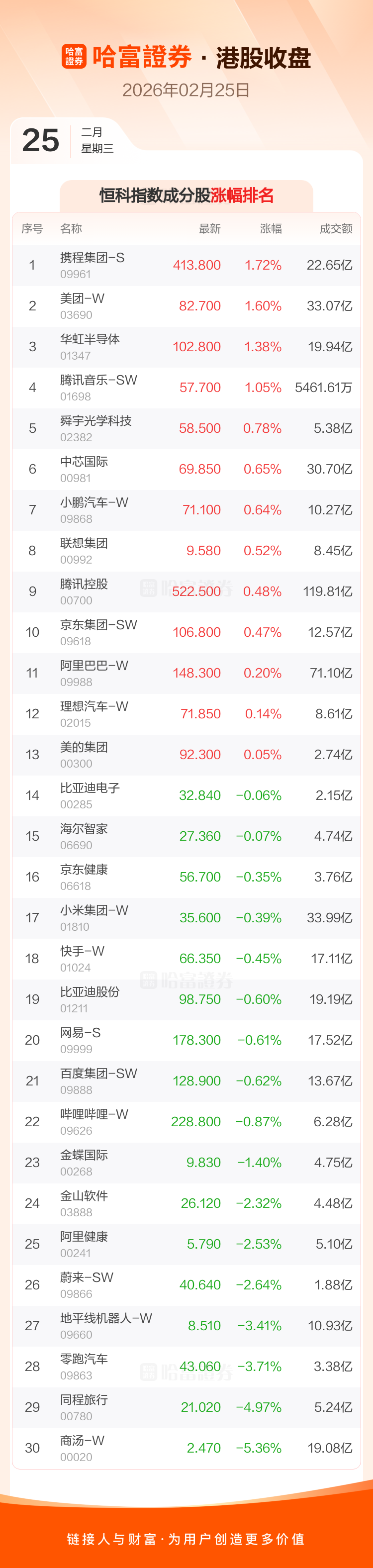 港股2月25日收盘走高,恒生指数收报26765.72点,涨175.4点,涨幅0.66%;恒生科技指数收报5260.5点,跌10.2点,跌幅0.19%。恒生指数成分股中海底捞、汇丰控股、龙湖集团涨幅居前,信义光能、万洲国际、中升控股跌幅靠前。恒生科技指数成分股中携程集团-S、美团-W、华虹半导体涨幅居前,商汤-W、同程旅行、零跑汽车跌幅靠前。