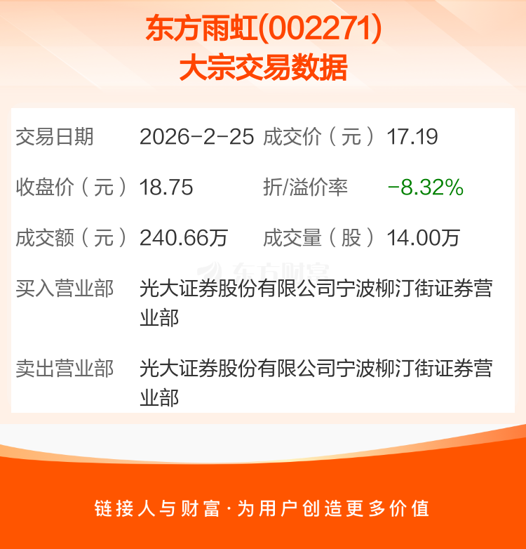 大宗交易:东方雨虹成交240.66万元,折价8.32%(2-25)