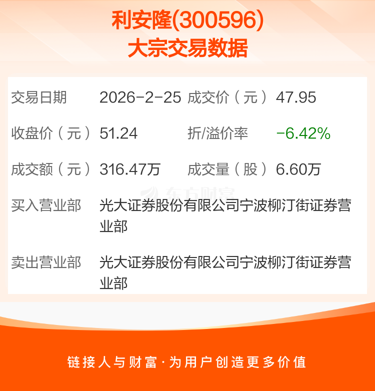 2026年2月25日,利安隆发生1笔大宗交易,共成交6.60万股,成交金额316.47万元,占其流通市值比例为0.03%。