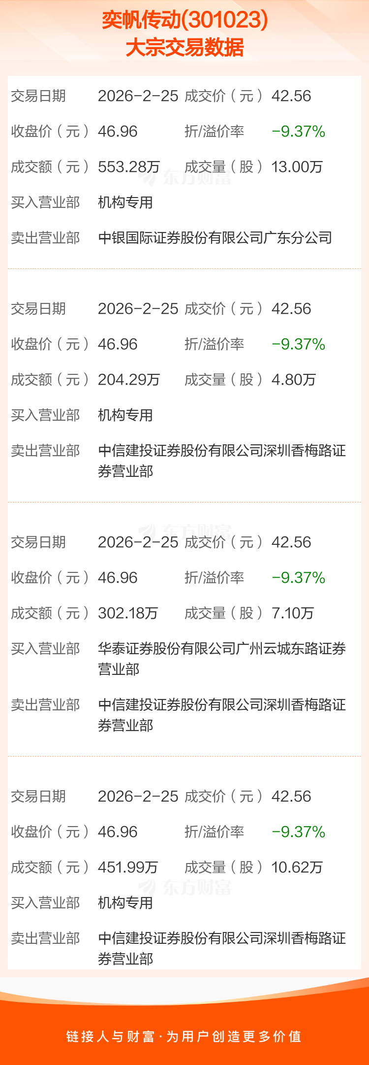 2026年2月25日,奕帆传动发生4笔大宗交易,共成交35.52万股,成交金额1511.74万元,占其流通市值比例为0.77%。