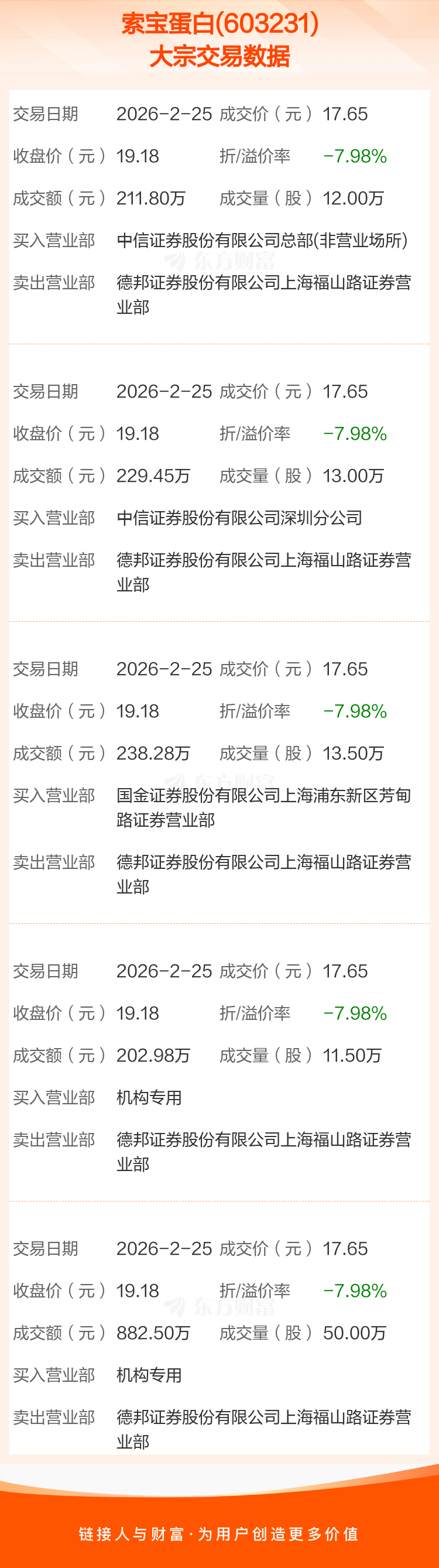 2026年2月25日,索宝蛋白发生5笔大宗交易,共成交100.00万股,成交金额1765.01万元,占其流通市值比例为0.87%。