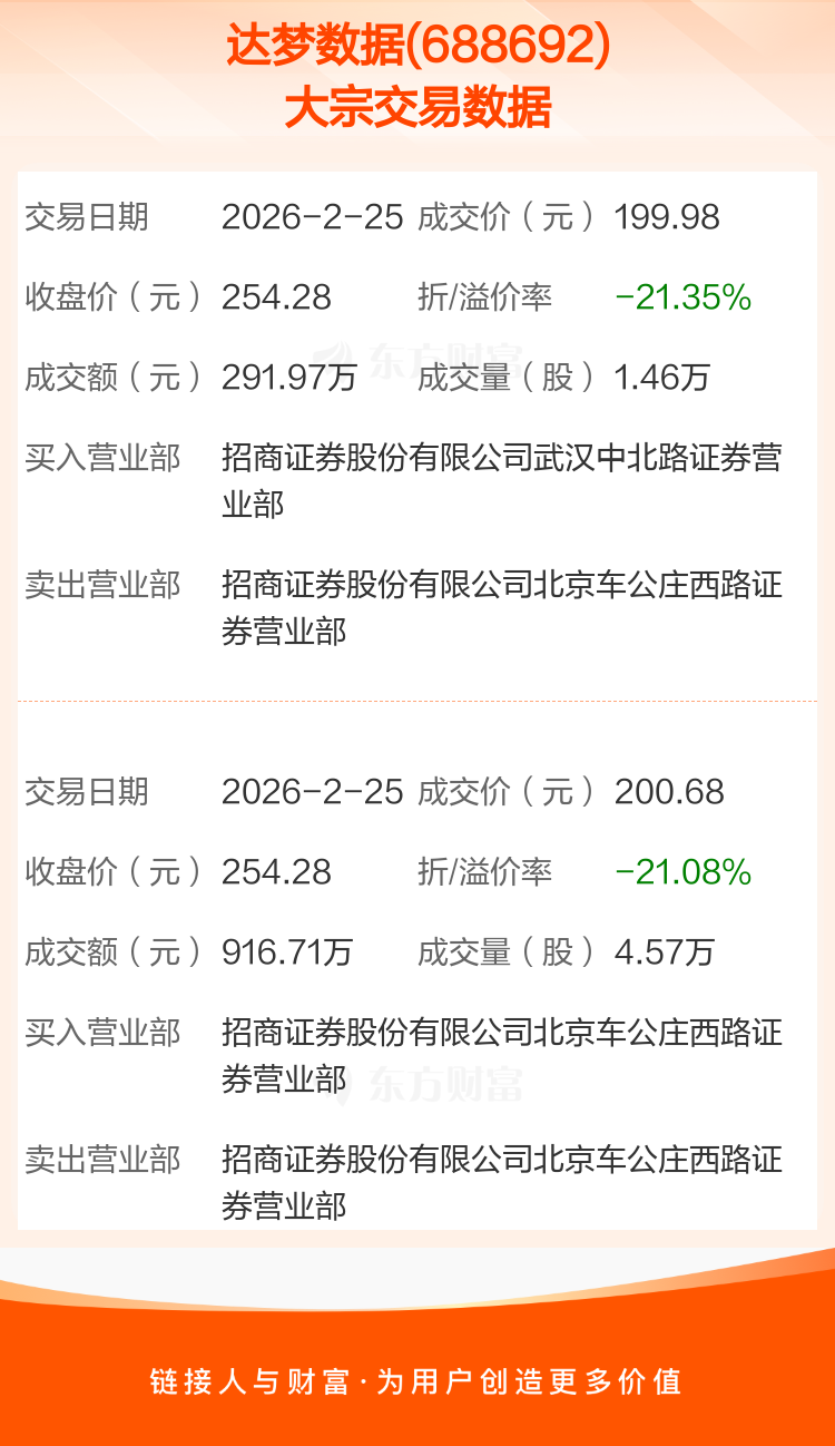 2026年2月25日,达梦数据发生2笔大宗交易,共成交6.03万股,成交金额1208.68万元,占其流通市值比例为0.06%。
