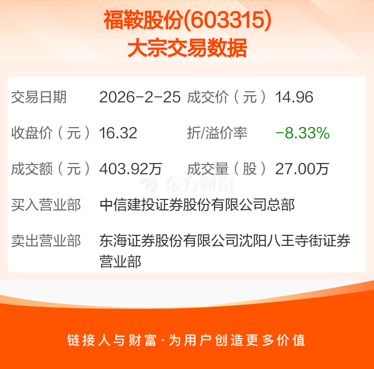 2026年2月25日,福鞍股份发生1笔大宗交易,共成交27.00万股,成交金额403.92万元,占其流通市值比例为0.08%。
