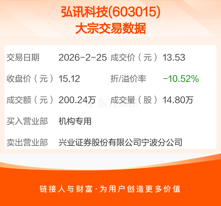 2026年2月25日,弘讯科技发生1笔大宗交易,共成交14.80万股,成交金额200.24万元,占其流通市值比例为0.03%。