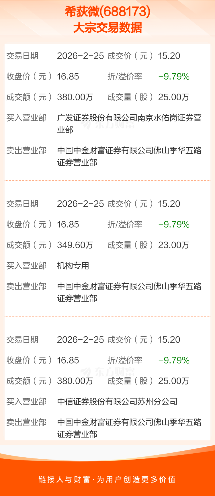 2026年2月25日,希荻微发生3笔大宗交易,共成交73.00万股,成交金额1109.60万元,占其流通市值比例为0.16%。