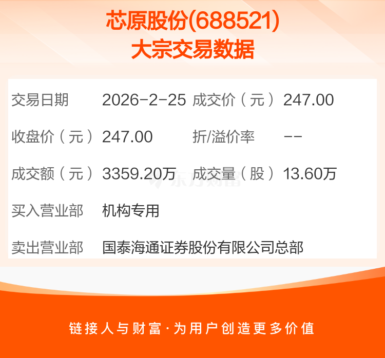 2026年2月25日,芯原股份发生1笔大宗交易,共成交13.60万股,成交金额3359.20万元,占其流通市值比例为0.03%。
