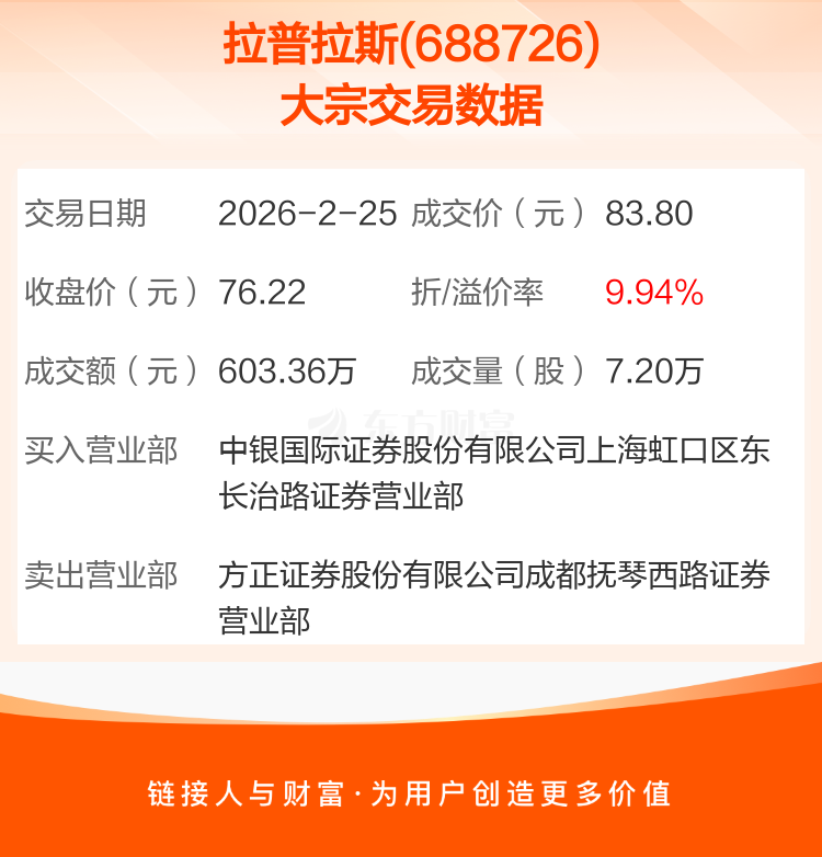 2026年2月25日,拉普拉斯发生1笔大宗交易,共成交7.20万股,成交金额603.36万元,占其流通市值比例为0.04%。