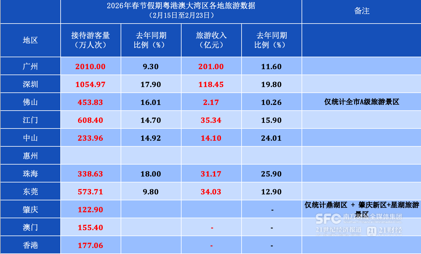 (2026年春节假期粤港澳大湾区各地旅游数据,数据来源:大湾区各市文旅部门。张小萌/制)