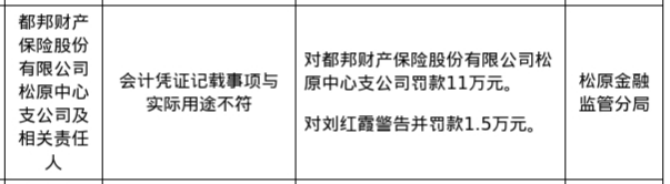 都邦财险松原中支被罚11万,涉会计凭证记载事项与实际用途不符