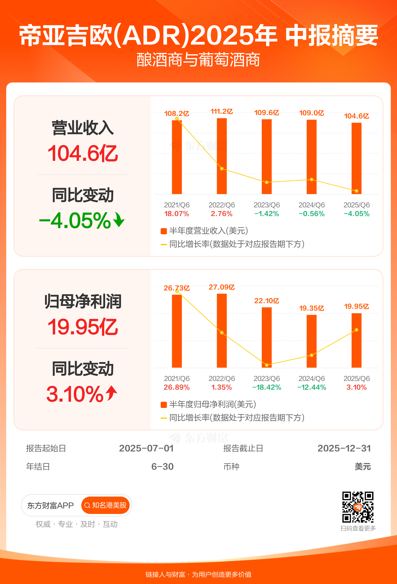 帝亚吉欧(ADR)2月25日发布中期业绩,截至2025年12月31日的6个月内,该公司营业收入104.60亿美元,同比减少4.05%;公司权益持有人应占溢利(归母净利润)19.95亿美元,同比增长3.10%。