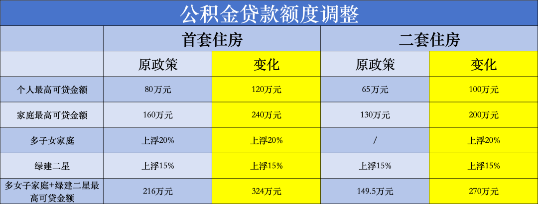 一是适度提高住房公积金最高贷款额度。将缴存人家庭购买首套住房的公积金贷款最高额度从160万元提高至240万元,叠加多子女家庭和购买绿色建筑最高贷款额度上浮政策(最高上浮35%),本市公积金家庭贷款最高额度可达到324万元。对购买第二套住房的最高贷款额度也相应提高。