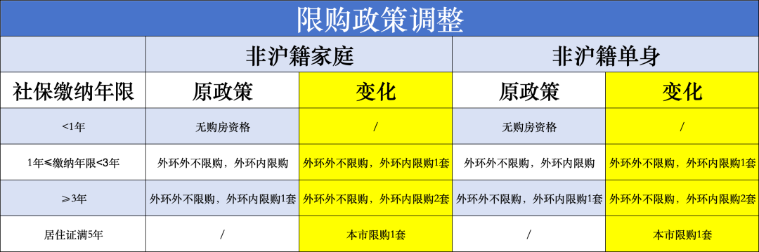 其一,缩短非沪籍居民购买外环内住房所需缴纳社保或个税年限。对非本市户籍居民家庭或成年单身人士购买外环内住房的,购房所需缴纳社会保险或个人所得税的年限,调整为购房之日前连续缴纳满1年及以上。