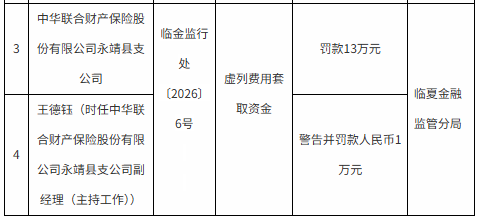 【大河财立方消息】2月25日,国家金融监督管理总局临夏监管分局披露的行政处罚信息公示表显示,中华联合财产保险股份有限公司永靖县支公司因虚列费用套取资金,被罚13万元。