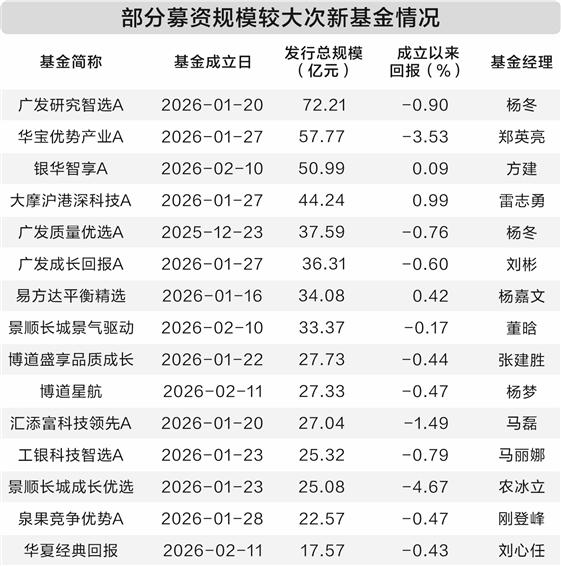 截至2月25日,上述次新基金成立以来净值波动普遍较小,尚处于建仓早期,募集资金有待入市。具体看,112只基金成立以来平均收益率为1.24%,中位数为-0.03%。例如,银华智享成立于2月10日,募集规模超50亿元,A份额成立以来收益率约为0.09%。成立于1月27日的大摩沪港深科技,募集规模为44.24亿元,A份额成立以来回报率约为0.99%。易方达平衡精选成立于1月16日,募集规模接近35亿元,截至目前收益率为0.42%。