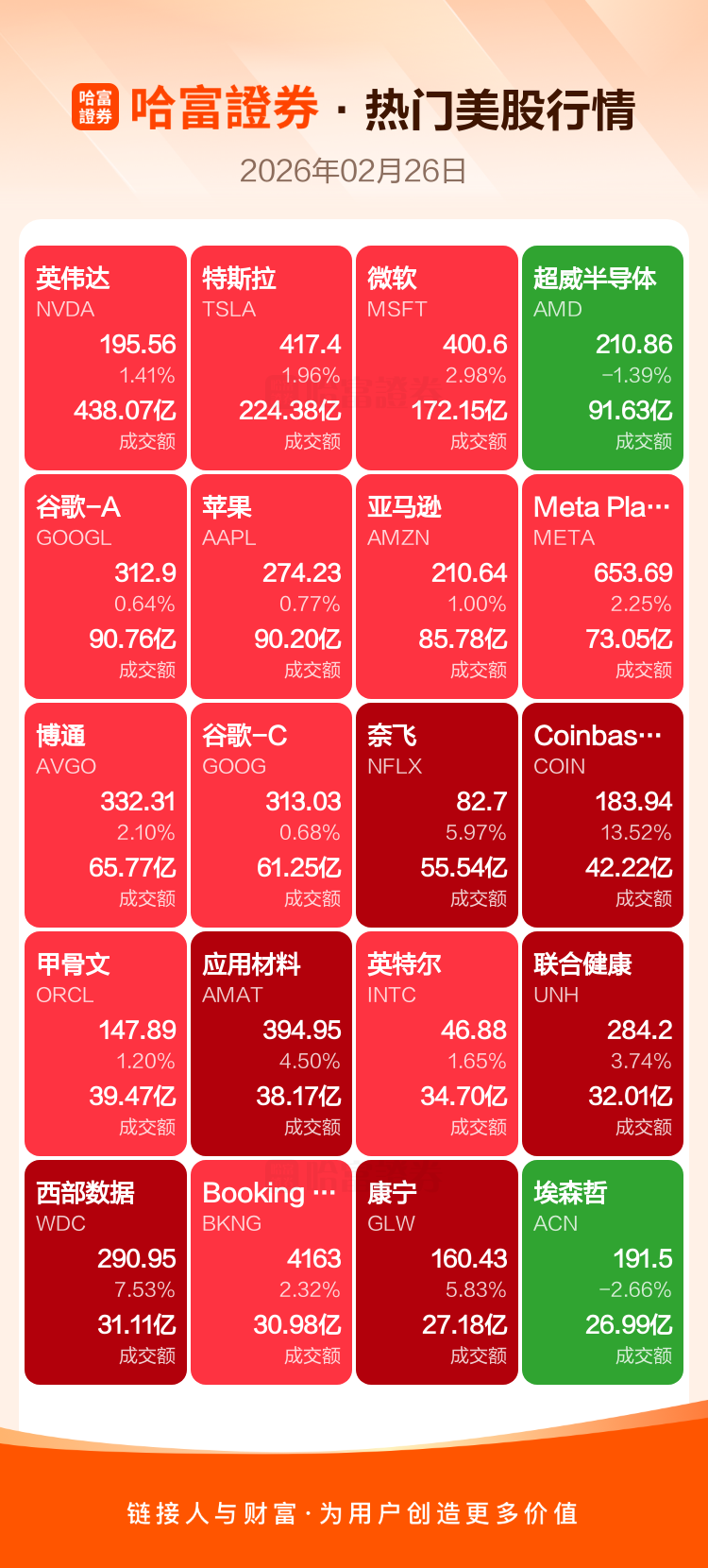 英伟达涨1.41%,特斯拉涨1.96%,微软涨2.98%,超威半导体跌1.39%,谷歌-A涨0.64%,苹果涨0.77%,亚马逊涨1.00%,Meta Platforms Inc-A涨2.25%,博通涨2.10%,谷歌-C涨0.68%。