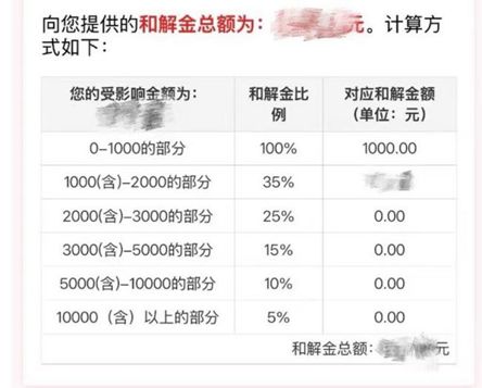 具体而言,1000元(含)至2000元的部分,和解金比例为35%;2000元(含)至3000元的部分,和解金比例为25%;3000元(含)至5000元的部分,和解金比例为15%;5000元(含)至10000元的部分,和解金比例为10%;10000元(含)以上的部分,和解金比例为5%。