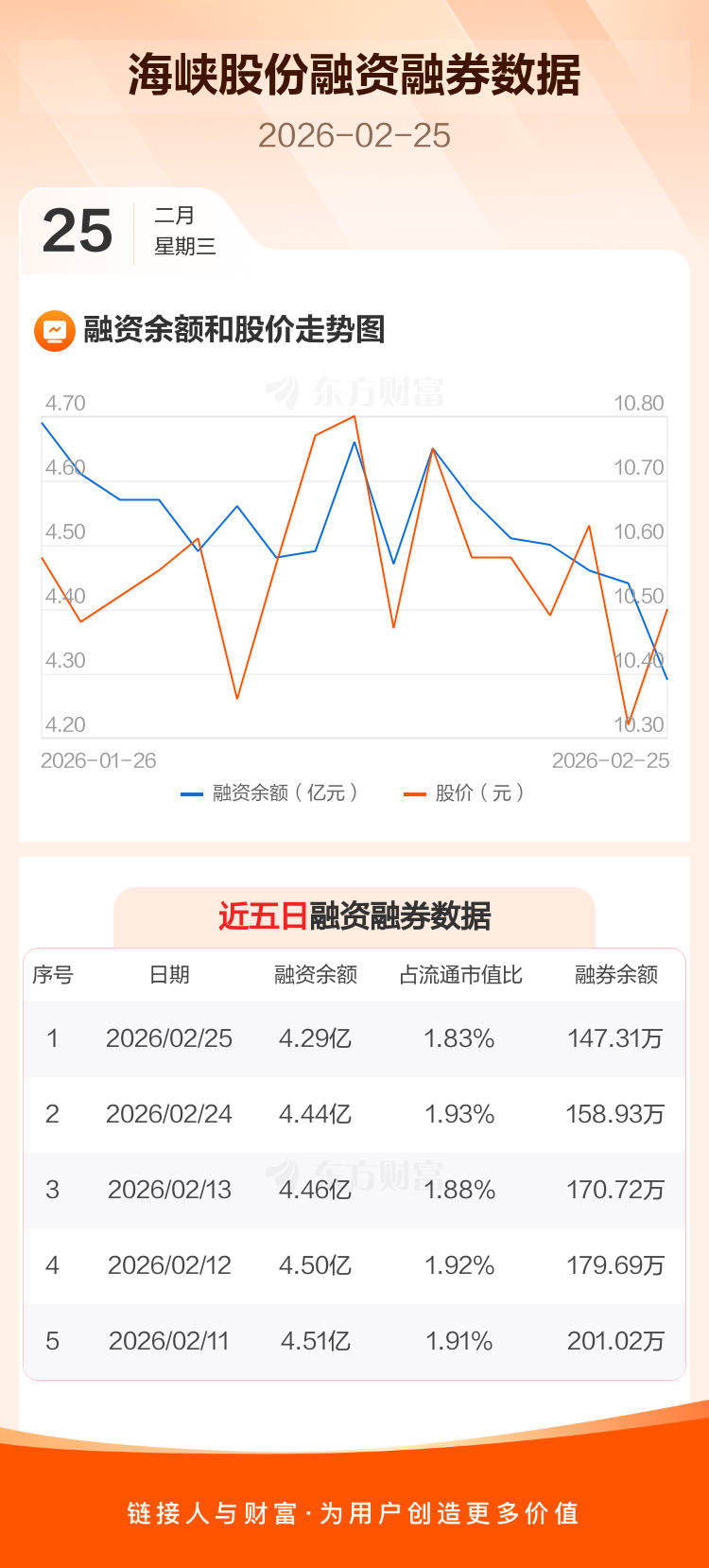 交易所最新数据显示,海峡股份于2026年2月25日获融资买入1809.95万元,融资偿还3357.55万元,当日融资净偿还1547.6万元。目前,该股融资余额4.29亿,占流通市值比例为1.83%。