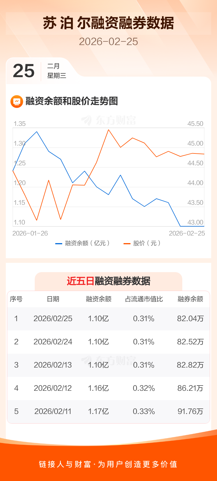 交易所最新数据显示,苏 泊 尔于2026年2月25日获融资买入309.84万元,融资偿还254.85万元,当日融资净买入54.99万元。目前,该股融资余额1.10亿,占流通市值比例为0.31%。
