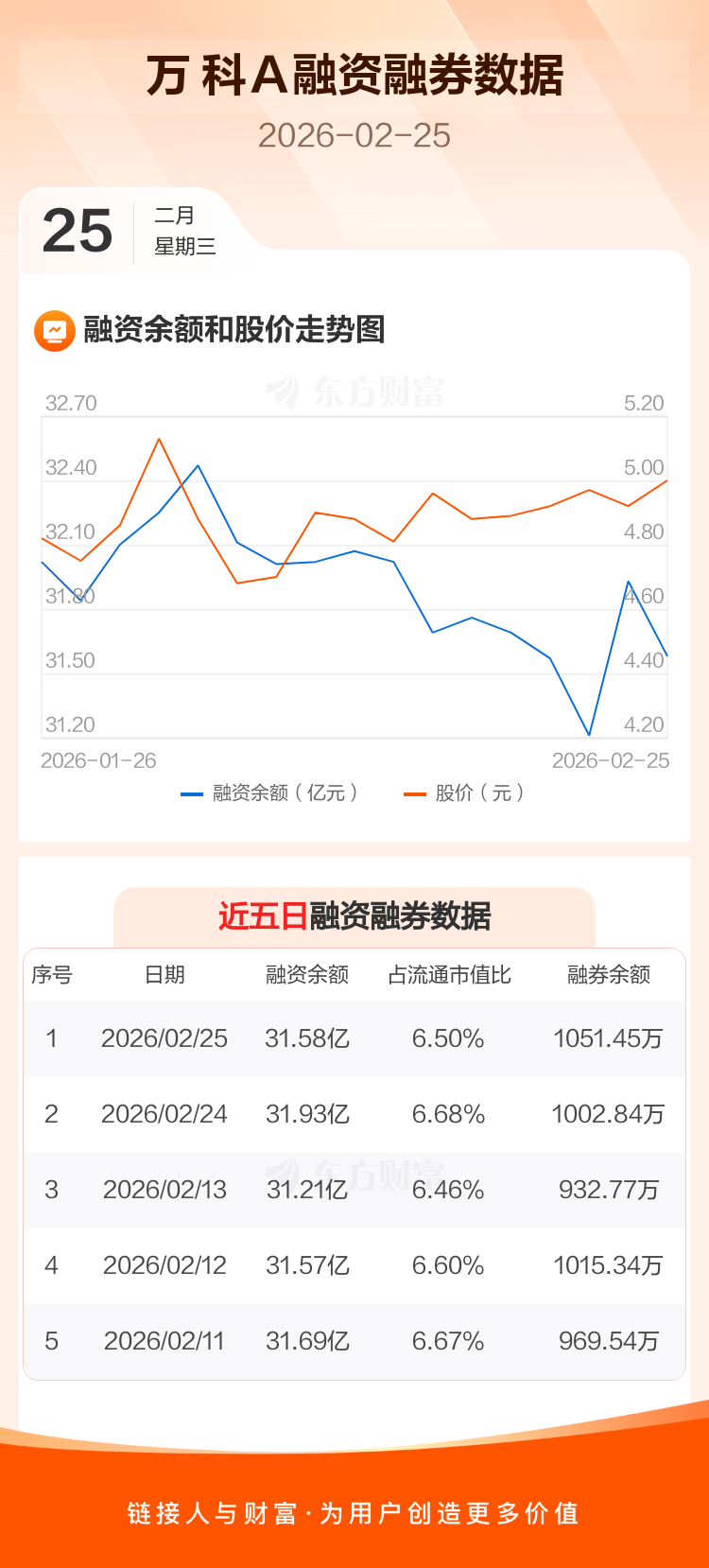 交易所最新数据显示,万 科A于2026年2月25日获融资买入9328.25万元,融资偿还1.28亿元,当日融资净偿还3456.32万元。目前,该股融资余额31.58亿,占流通市值比例为6.50%。