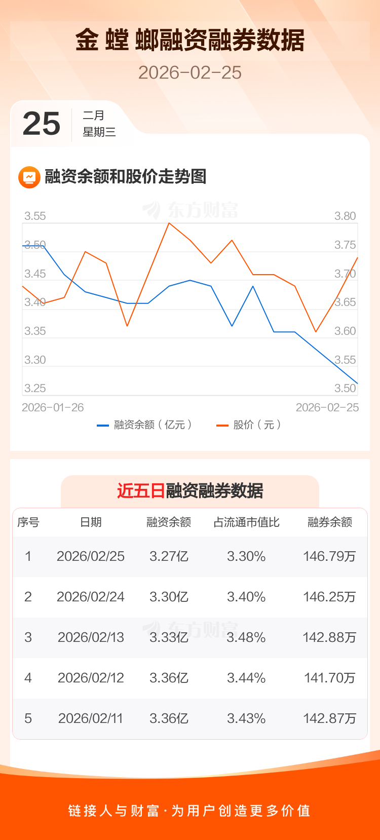 交易所最新数据显示,金 螳 螂于2026年2月25日获融资买入1401.36万元,融资偿还1727.77万元,当日融资净偿还326.41万元。目前,该股融资余额3.27亿,占流通市值比例为3.30%。