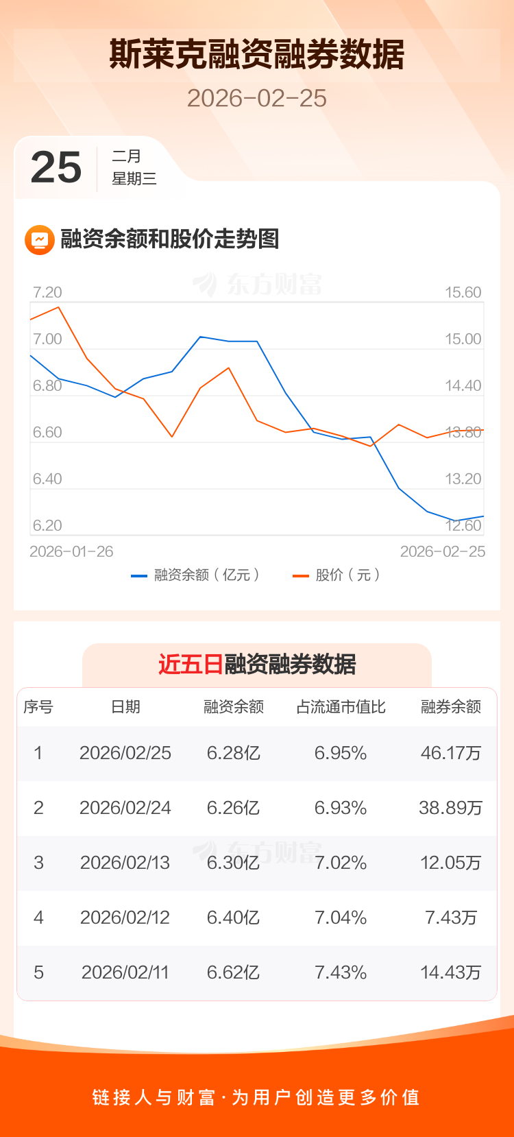 交易所最新数据显示,斯莱克于2026年2月25日获融资买入1844.94万元,融资偿还1627.26万元,当日融资净买入217.69万元。目前,该股融资余额6.28亿,占流通市值比例为6.95%。
