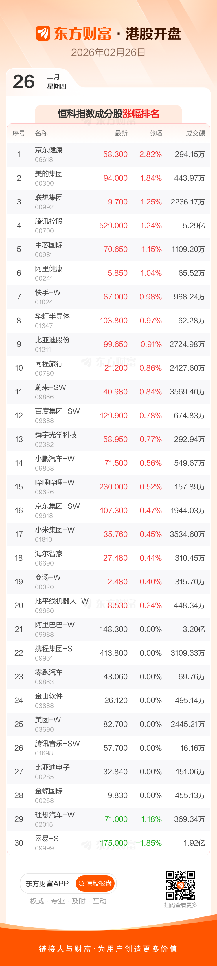港股2月26日高开,恒生指数开盘报27019.74点,涨254.02点,涨幅0.95%;恒生科技指数开盘报5284.51点,涨24.01点,涨幅0.46%。恒生指数成分股中李宁、友邦保险、汇丰控股涨幅居前,新东方-S、网易-S、中升控股跌幅靠前。恒生科技指数成分股中京东健康、美的集团、联想集团涨幅居前,网易-S、理想汽车-W、金蝶国际跌幅靠前。