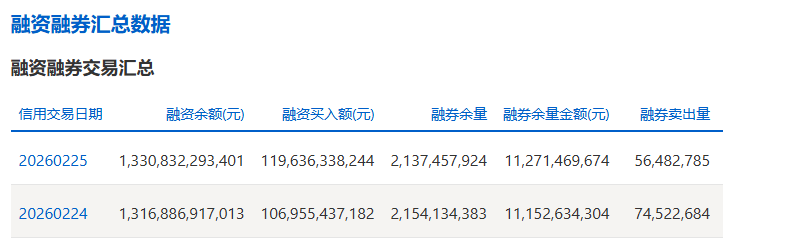 上证报中国证券网讯截至2月25日,上交所融资余额报13308.32亿元,较前一交易日增加139.45亿元;深交所融资余额报12905.51亿元,较前一交易日增加96.88亿元;两市合计26213.83亿元,较前一交易日增加236.33亿元。