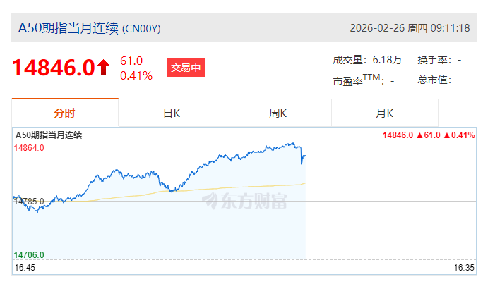 上证报中国证券网讯 2月26日,富时中国A50指数期货在上一个交易日夜盘收涨0.49%的基础上高开。截至9时11分,主力合约涨0.41%。