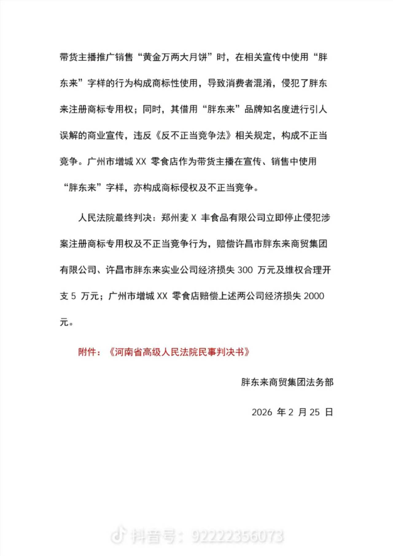 胖东来公示中提到,2024年以来,市面上出现由郑州麦X丰食品有限公司委托生产,宣传,销售的“黄金万两大月饼”,该产品通过以广州市增城XX零食店为代表的多平台带货主播宣传、销售,大量使用“胖东来”相关标识、字样,导致消费者混淆误认。胖东来发现该侵权行为后,立即进行取证,固定相关证据,并依法提起诉讼进行维权。