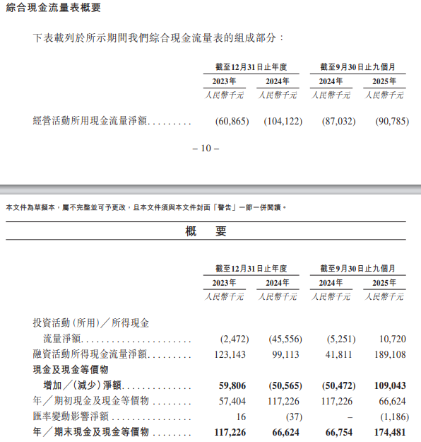 展望未来,公司预计将持续录得亏损,且随着公司加大研发投入和加强销售及营销活动,预计亏损可能会增加。截至2023年及2024年12月31日止年度以及截至2025年9月30日止九个月,公司经营活动所用的净现金流量分别为人民币60.9百万元、人民币104.1百万元及人民币90.8百万元。