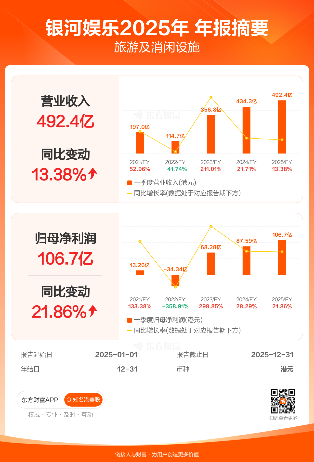 银河娱乐2月26日发布年报业绩,截至2025年12月31日的12个月内,该公司营业收入492.42亿港元,同比增长13.38%;公司权益持有人应占溢利(归母净利润)106.74亿港元,同比增长21.86%,低于机构一致预测的114.07亿港元。