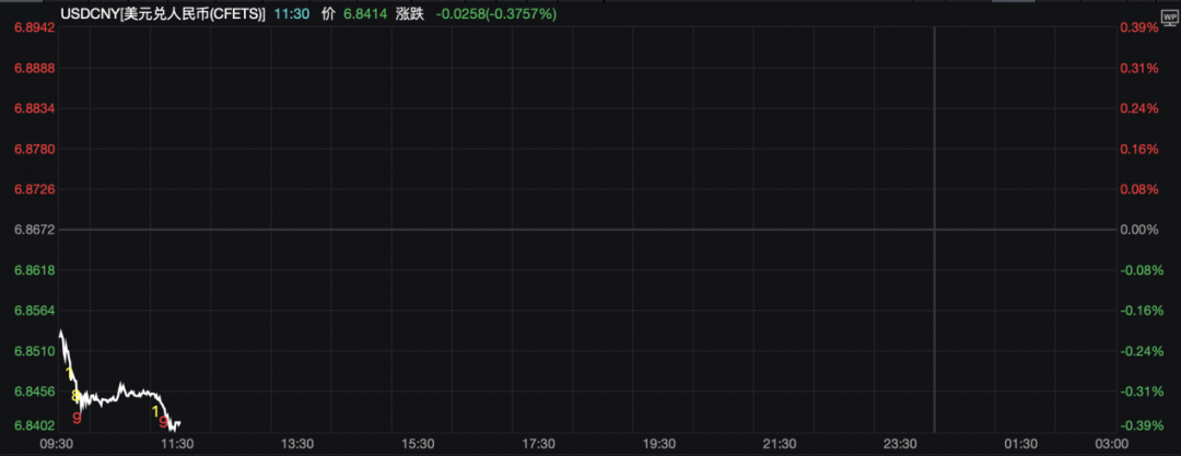 Wind数据显示,截至11:30,在岸人民币对美元汇率报6.8414元,较前收盘价上涨258个基点,盘中最高报6.8402元;离岸人民币对美元汇率报6.8374元,较前收盘价上涨171个基点,盘中最高报6.8361元。