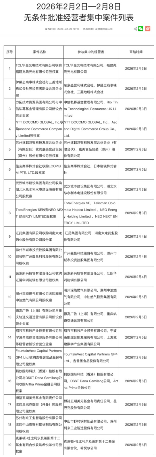 国家市场监督管理总局发布《2026年2月2日-2月8日无条件批准经营者集中案件列表》,其中包括TCL华星光电收购福建兆元光电有限公司股权案。