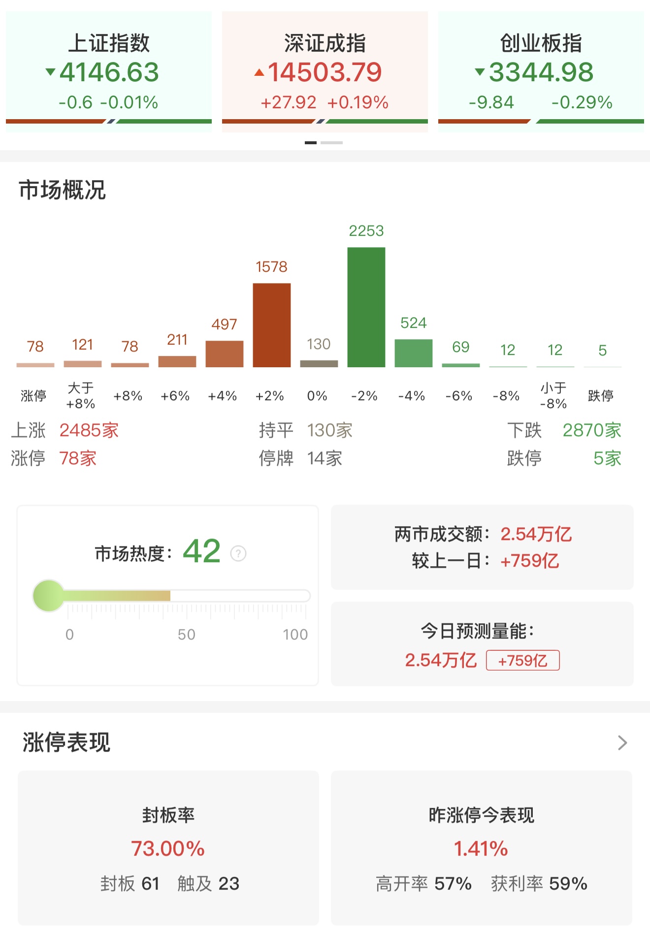 财联社2月26日电,市场探底回升,三大指数涨跌不一,创业板指盘中一度跌超1%,黄白线分化。沪深两市成交额2.54万亿,较上一个交易日放量759亿。盘面上,市场热点快速轮动,全市场超2800只个股下跌。从板块来看,算力硬件方向涨幅居前,PCB、CPO、液冷服务器、算力芯片概念均表现强势,深南电路、大族激光、广合科技、川润股份涨停。电力板块走强,赣能股份2连板,华银电力涨停。燃气轮机概念集体大涨,应流股份、万泽股份、东方电气、常宝股份封涨停。小金属概念表现活跃,云南锗业、章源钨业双双2连板。环保股尾盘拉升,中科环保、启迪环境封涨停。下跌方面,影视院线、保险、房地产等板块跌幅居前。其中影视院线概念股连续大跌,博纳影业触及跌停。截至收盘,沪指跌0.01%,深成指涨0.19%,创业板指跌0.29%。