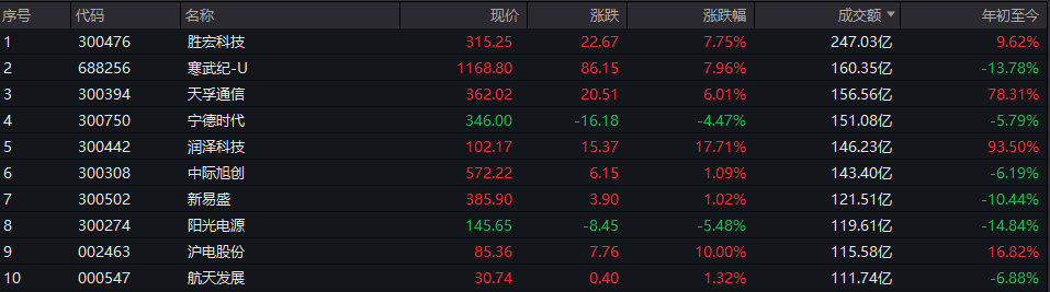 个股方面,胜宏科技成交额超247亿元居首,寒武纪-U、天孚通信、宁德时代成交额靠前。