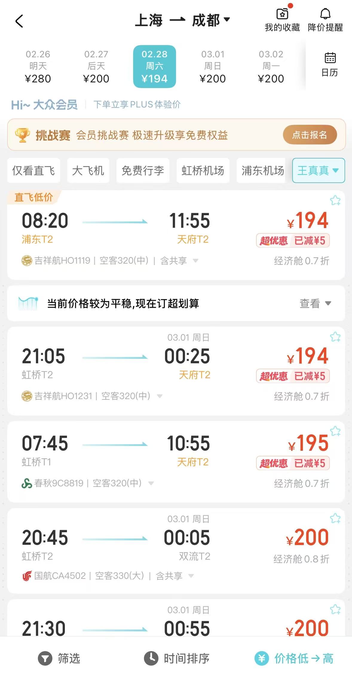 2月28日,上海飞成都的最低票价仅为194元。截图