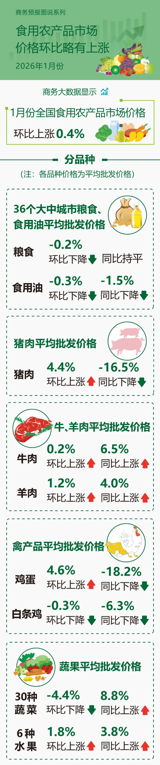 上证报中国证券网讯商务大数据显示,1月份全国食用农产品市场价格环比上涨0.4%。
