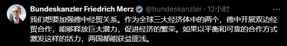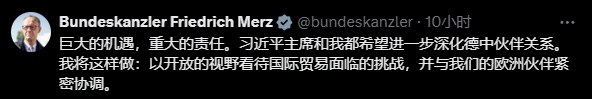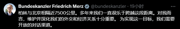 德国总理默茨25日访华第一天,在社交媒体上用中文连发三条消息。他抵达后发的第一条帖子写道:“柏林与北京相隔近7500公里。多年来我们一直很乐于跨越这段距离。对我而言,维护并深化我们的外交和经济关系十分重要。为实现这一目标,我们需要开放的对话渠道。”