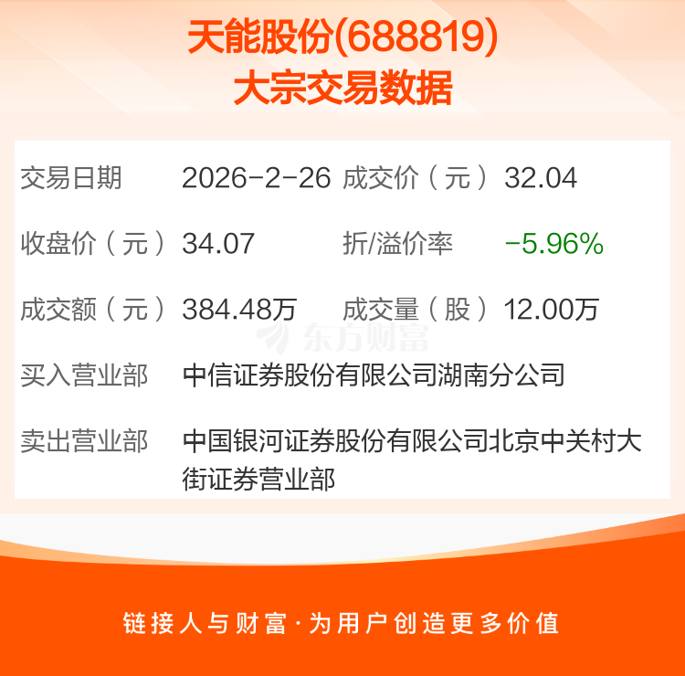2026年2月26日,天能股份发生1笔大宗交易,共成交12.00万股,成交金额384.48万元,占其流通市值比例为0.01%。