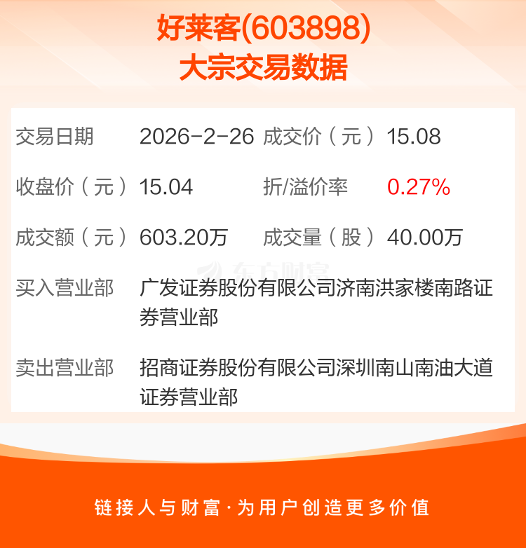 2026年2月26日,好莱客发生1笔大宗交易,共成交40.00万股,成交金额603.20万元,占其流通市值比例为0.13%。