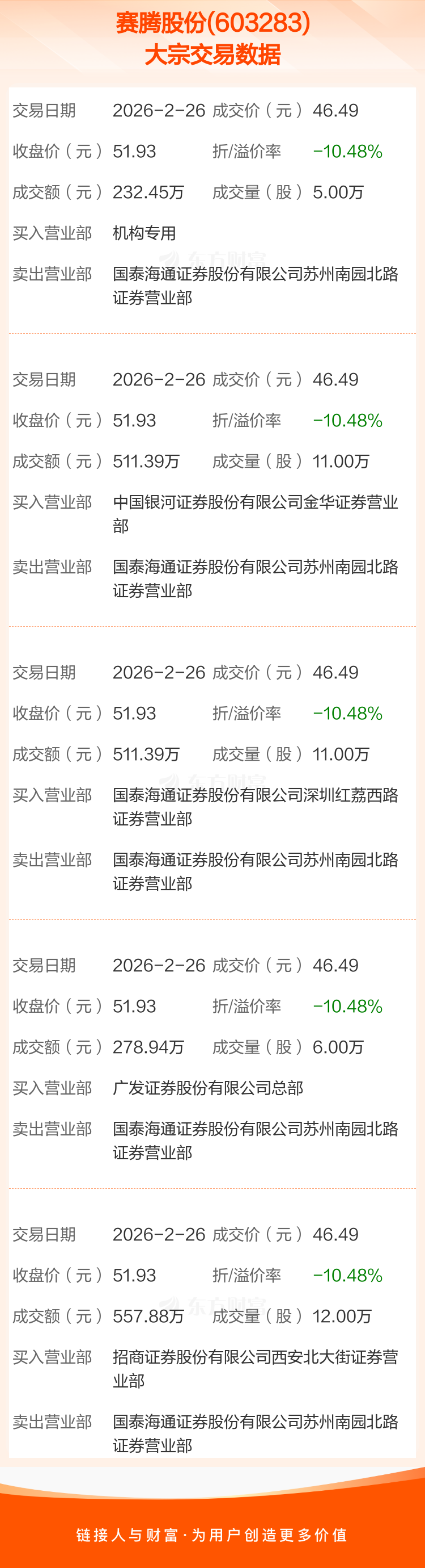 2026年2月26日,赛腾股份发生5笔大宗交易,共成交45.00万股,成交金额2092.05万元,占其流通市值比例为0.15%。